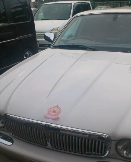 工場長のジャガーに、ももじり?の切り抜きをテープでくっつけて遊ぶ私達。