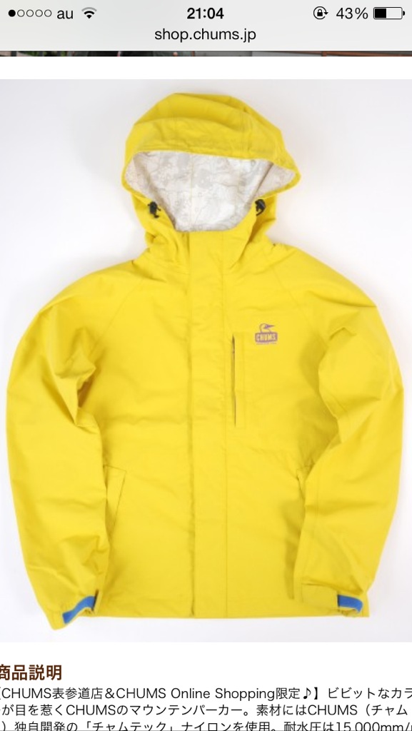 チャムチャム このマウンテンパーカーすっごく欲しいな〜〜〜。でも高いな〜〜。ボーナスでマリメッコのリュック買おうと思って予約しちゃったしな〜〜。でも街中でこれ着てたら目立つよね〜。でも欲しいな〜〜高いな〜〜。でもでも買っても着る機会あるかな〜。寒さに強いのかな〜〜。と考えているだけで終わりそうなのであった。